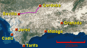 Am Sonntag war nichts mehr von dem tiefblauen Himmel des letzten Tages zu sehen. Statt dessen hingen dunkle Wolken über der Stadt und es regnete monoton. So schnelle Wetterwechsel hatte ich bisher selten erlebt. Unser geplanter Besuch des Alcazar de los Reyes Cristianos fiel somit im wahrsten Sinne des Wortes ins Wasser. Wir packten unser Hab und Gut zusammen und liefen dann los Richtung Parkhaus, um das Auto zu holen und dann das Gepäck einzuladen. Zum Glück hatte ich meinen Regenschirm mitgenommen, so dass wir jetzt halb trocken vorwärts kamen. Auf dem Weg fanden wir eine geöffnete Cafeteria, in welcher wir frühstückten. Dann liefen wir weiter zum Parkhaus, lösten dort mein Auto aus und wollten so weit es ging zum Hotel fahren. Wie es der Zufall so wollte kam ich aus dem Parkhaus nur in eine Richtung heraus - Einbahnstraße... Aus meinem Plan des einfachen zurückfahrens wurde nichts. Statt dessen fand ich mich wenig später beim durchqueren der Fußgängerzone wieder und dann in den engen Gassen der Altstadt, die ich zuvor freiwillig nicht befahren wollte. Wir umkreisten einmal das Hotel, fanden von einer Einbahnstraße in die andere bis wir endlich an einer Stelle ankamen wo wir parken konnten. Zum Glück war Sonntag vormittag und entsprechend wenig los. Im Hotel checkten wir aus, verabschiedeten uns von der Besitzerin, packten das Gepäck ins Auto und wollten nun endlich nach Sevilla fahren, auch in der Hoffnung auf besseres Wetter. Leider blieb uns Córdoba noch eine Weile erhalten, den die Stadt hat das gleiche Problem wie andere große spanische Städte auch: nirgendwo ist richtig angeschrieben wo es denn nun wieder aus der Stadt heraus geht. So mußte ich mich anhand der Karte etwas orientieren, feststellen, dass wir in die völlig entgegengesetzte Richtung gefahren waren und dann waren wir endlich auf der Straße Richtung Sevilla.